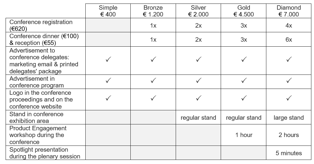 The easiest way to participate from within the industry, besides buying a regular conference registration ticket, is to register directly in the registration system for an “Industry booth”. This gives you access to the conference for two people, plus the possibility to place a stand/booth at the industry marketplace. The price for this industry ticket is the regular registration fee times 2 plus 10%. At an early bird rate, this price amounts to 1.450EUR (tax-exempt). For more details visit key dates and fees . To register using this option, go to conftool and select the correct option in the regular registration procedure.
